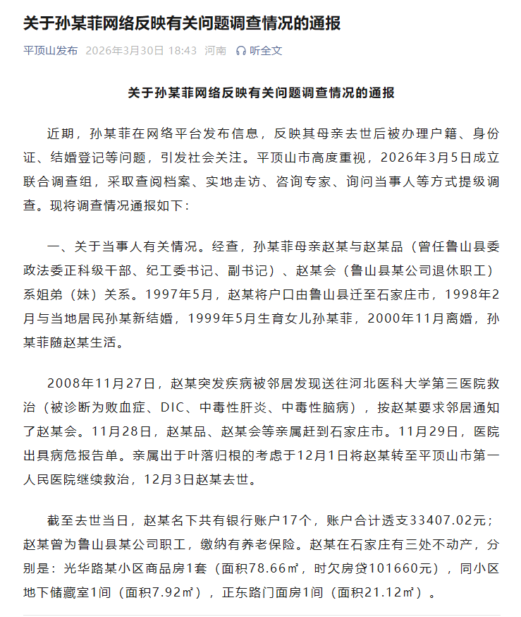 近期,孙某菲在网络平台发布信息,反映其母亲去世后被办理户籍、身份证、结婚登记等问题,引发社会关注。平顶山市高度重视,2026年3月5日成立联合调查组,采取查阅档案、实地走访、咨询专家、询问当事人等方式提级调查。现将调查情况通报如下: