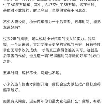 关于卖车这两年时间,雷军说累计卖出60万辆,其中su7卖了38万辆,这在当时,想都不敢想。新一代su7在安全,驾控,智能体验和豪华质感上,都有非常大的提升,同时表示新车肯定会涨价。
