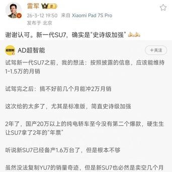 数据显示,去年su7销量大约25.8万台,平均月销量2.15万台,全新su7今年4月交付,今年能卖9个月,产能给力的话,卖20万台问题不是太大。yu7月销量三万台左右,今年卖35万台问题不大,加起来就能完成雷军定下的55万台销量目标。19日发布会,不仅有汽车,据说还有高端笔记本电脑和其它新品。那么大家觉得全新su7月销量能稳定在2万台以上吗。